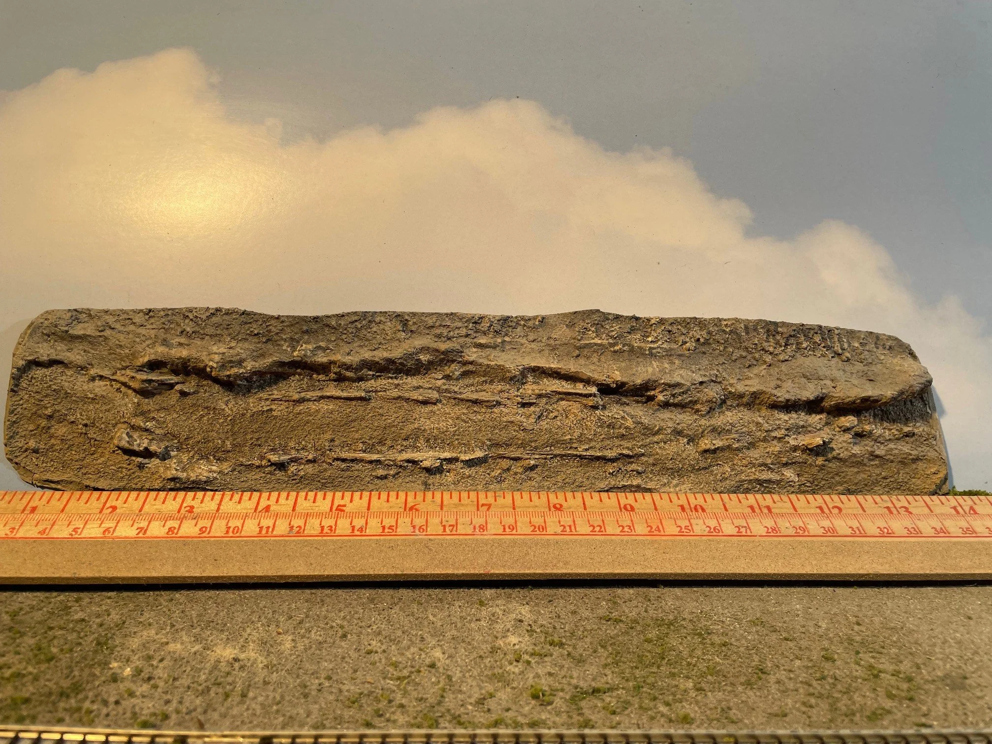 Let’s start with something simple: a low soil embankment where the lower level soils are eroding away, but the uppermost soil has been stabilized by the roots of trees and other vegetation, and overhangs the lower soils a little bit. This is a really common occurrence, especially in forested areas and wetter climates. Dirt Embankment portrays this nicely, with the lower levels showing just a few spots sticking out of the soil, and the upper layer overhanging a bit. Add a few bits of fiber (or real grass roots) along the bottom of the overhang, and you’re pretty much done! Dimensions are 14 inches by 3 inches, with low relief of about a half inch.